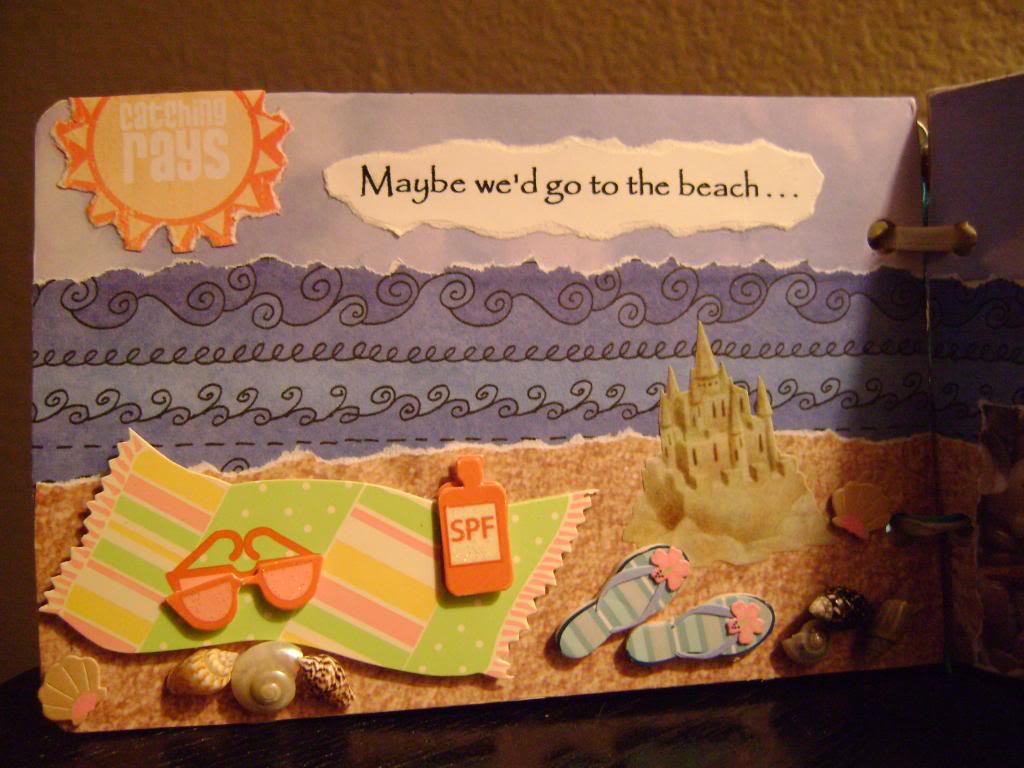 Materials/medium: Small children’s board book (about 4″ x 6″), scrapbook paper, ribbon, pressed flowers, tiny seashells, photographs, scrapbook accessories, acrylic paint, beads.